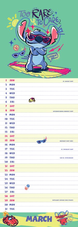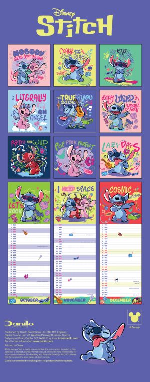 Join Stitch for a year of fun and adventure with this official Stitch 2026 slim calendar! Featuring adorable images of Disney’s mischievous blue alien, this compact calendar is perfect for Lilo & Stitch fans. This calendar is plastic free.