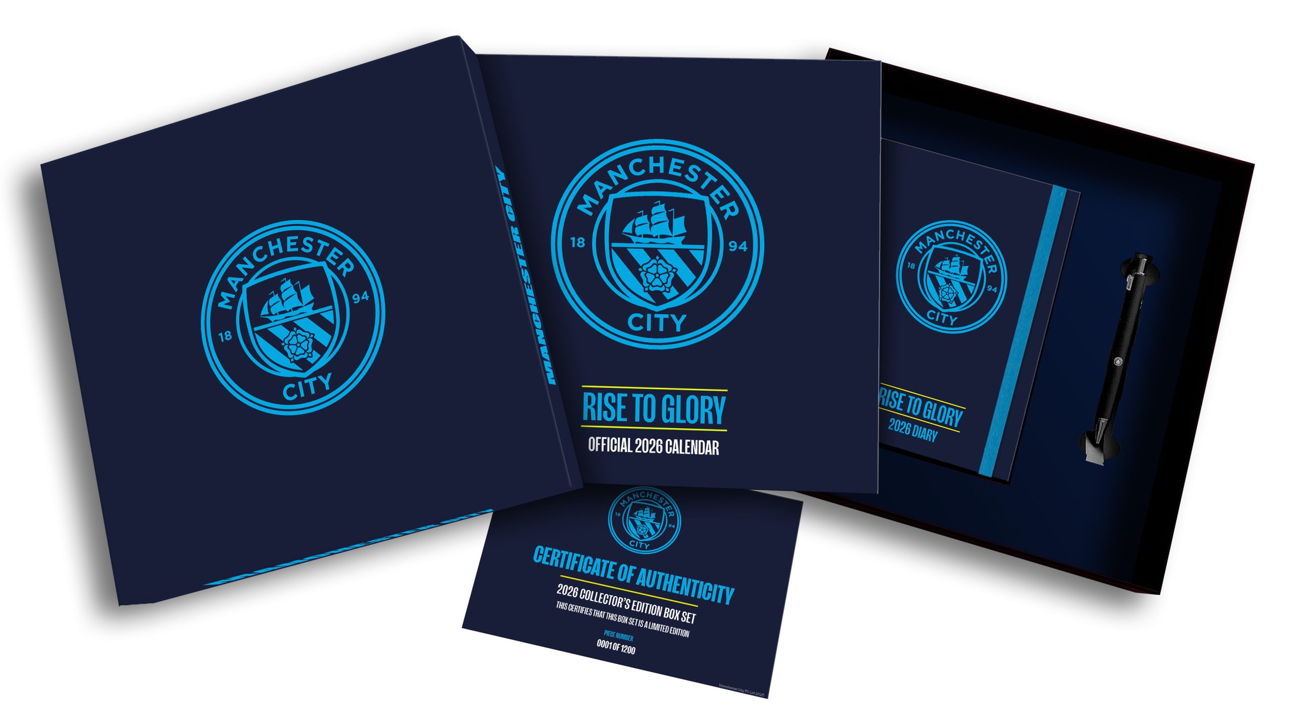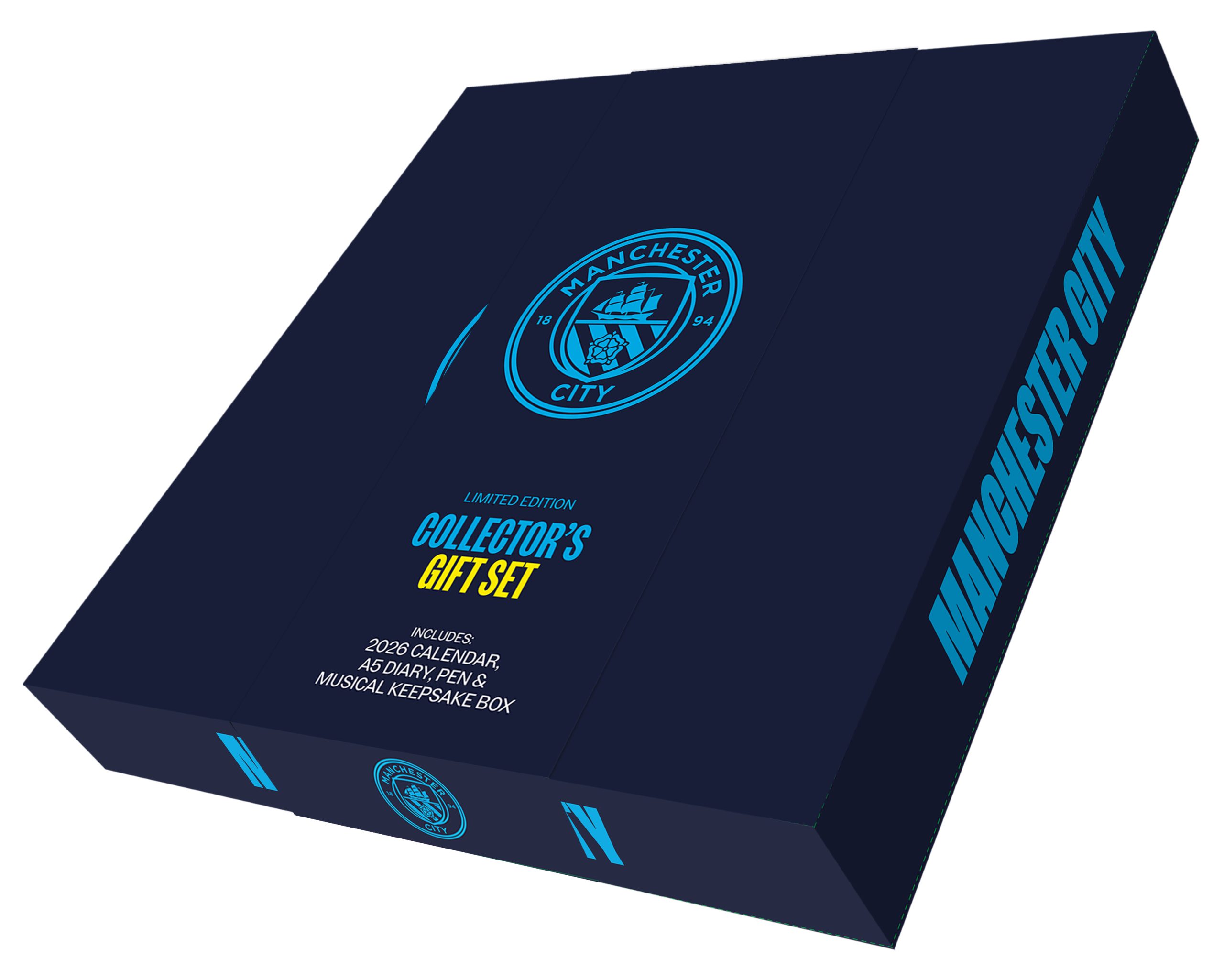 This exclusive gift box set is the ultimate treat for any Manchester City FC fan. The set includes an official 2026 calendar, a matching diary, and a branded pen, all beautifully packaged for the ultimate fan experience. Plus, the lid plays an iconic anthem when lifted, adding an extra special touch for the Cityzens. Officially licensed and printed on premium-quality paper.