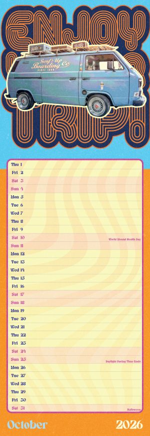This slim wall calendar design is perfect for a smaller wall space and features a month-to-view layout, with a range of images of these famous vans plus space to write in your plans and appointments for 2026.